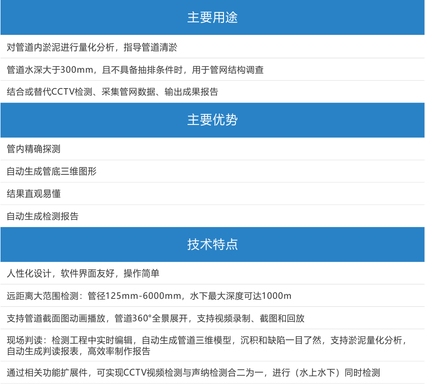 TS-GD200S管道聲吶檢測系統(tǒng)主要用于帶水管道(滿水或2/3以上水位)、檢查井或地下空洞檢測,自動分析提取內(nèi)壁輪廓,建立三維模型,并進(jìn)行量化分析。