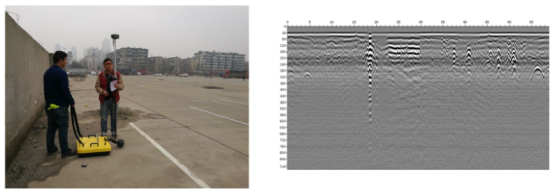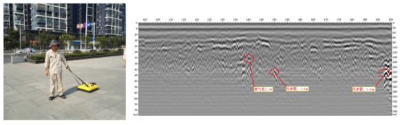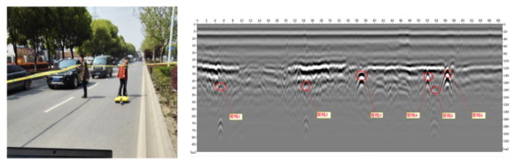 圖1. 用200MHz探地雷達管線測試人行橫道管線分布情況進行市政管線探測
