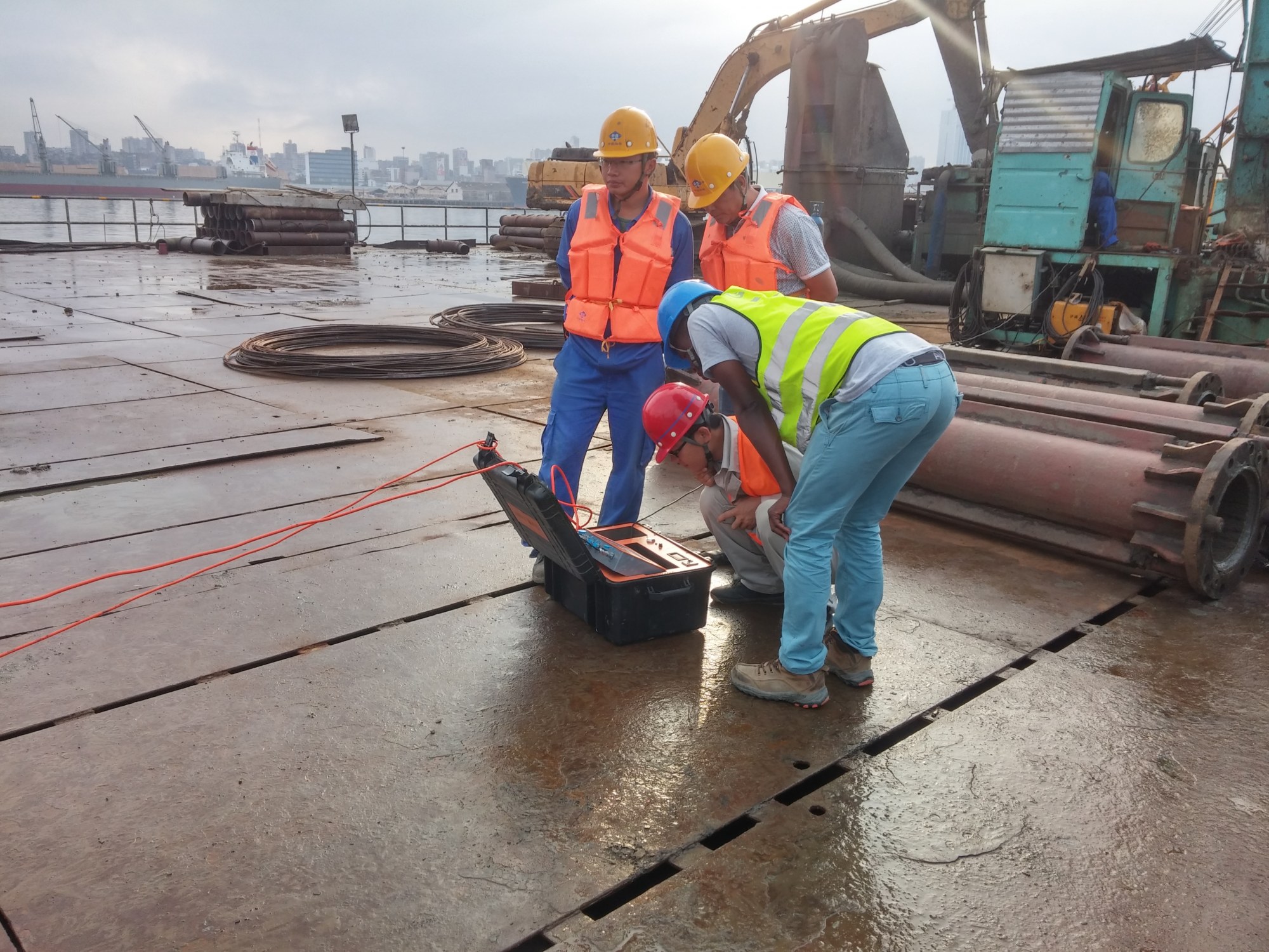 武漢天宸的TS-K150型超聲成孔成槽檢測儀有幸參與見證了這一重要歷史進程,并為大橋主橋和連接線的成孔質(zhì)量檢測貢獻力量!我公司工作人員親臨現(xiàn)場,與非洲兄弟并肩戰(zhàn)斗!
