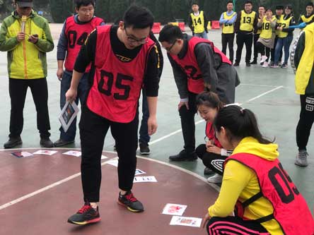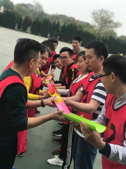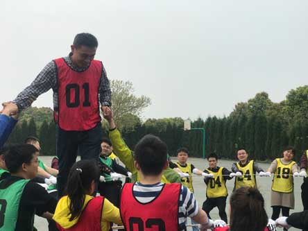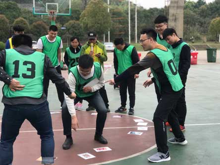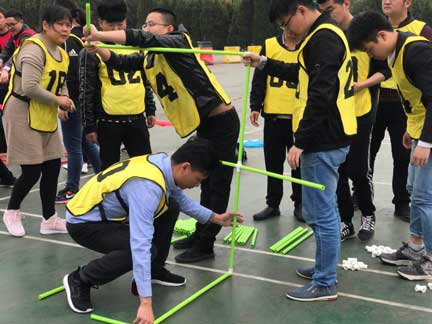 所有人手拉手圍成一圈,讓公司領(lǐng)導(dǎo)和新進同事分別在繩圈上走一圈;集體轉(zhuǎn)動繩圈,充分展示團隊的力量。