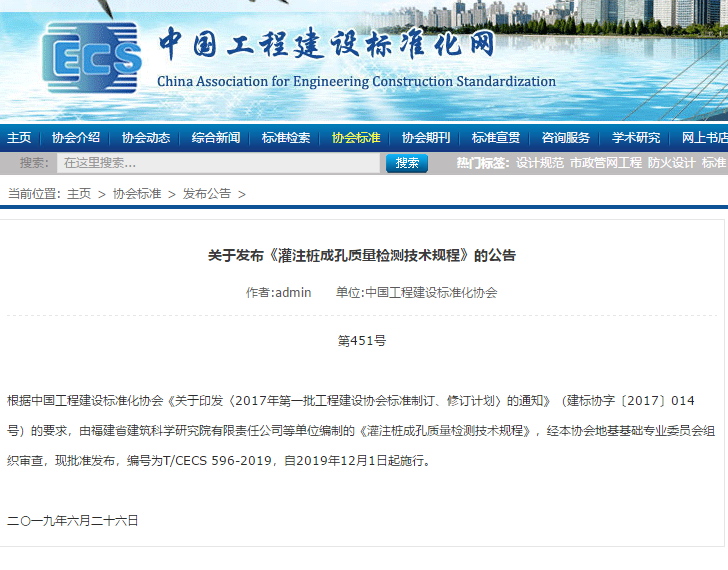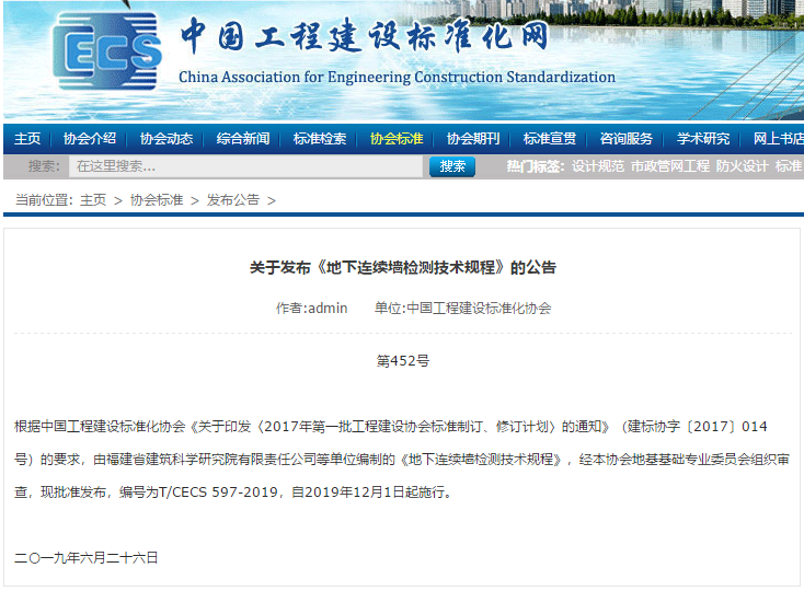 由福建省建科院、武漢天宸偉業(yè)物探科技有限公司等單位參與主編的《灌注樁成孔質(zhì)量檢測(cè)技術(shù)規(guī)程》T/CECS596-2019《地下連續(xù)墻檢測(cè)技術(shù)規(guī)程》T/CECS 597-2019順利通過(guò)審查,自2019年12月1日啟施行。