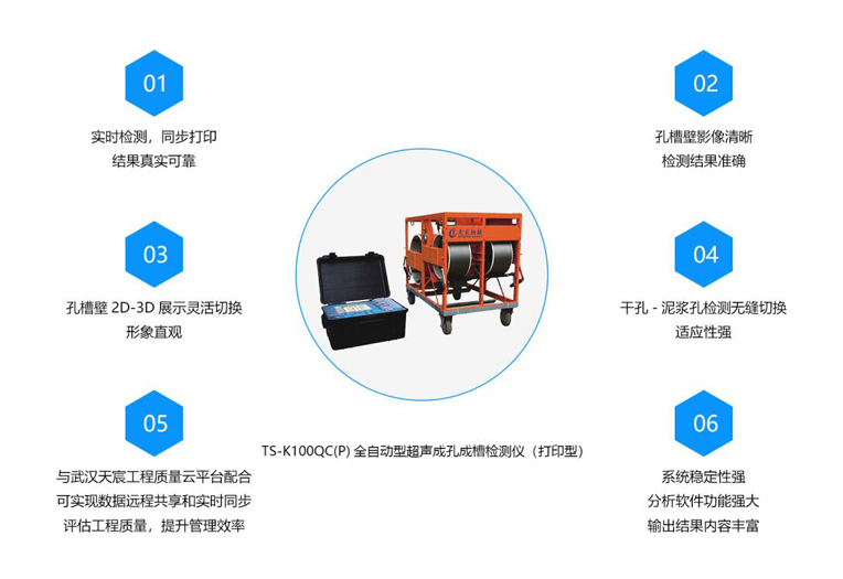 武漢天宸自2013年推出第一代全自動(dòng)型TS-K100/K160型超聲成孔成槽檢測(cè)儀以來(lái),產(chǎn)品不斷創(chuàng)新升級(jí),逐漸推出了第二代全自動(dòng)TS-K100QC(B)型,第三代同步檢測(cè)孔徑沉渣的多功能TS-K100DC(B)型,第四代集成無(wú)線傳輸,實(shí)時(shí)鏈接云平臺(tái),實(shí)現(xiàn)數(shù)據(jù)遠(yuǎn)程共享和結(jié)果遠(yuǎn)程評(píng)估的無(wú)線全自動(dòng)TS-K100QC(W)型,此次在天津地鐵四號(hào)線再立新功的是第五代現(xiàn)場(chǎng)同步打印的TS-K100QC(P)型。