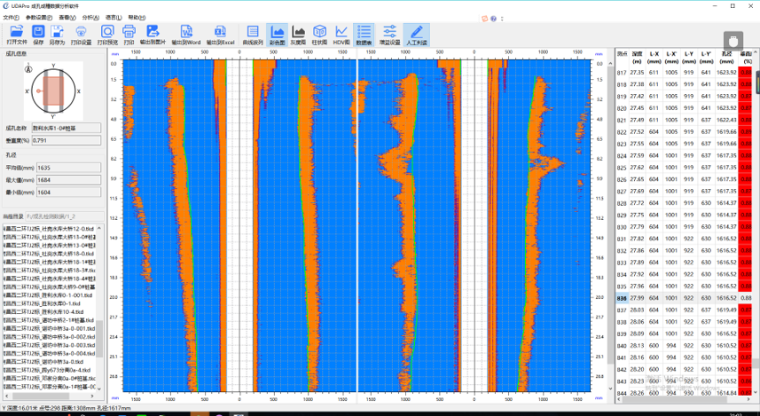 孔槽壁可2D-3D展示,靈活切換、形象直觀,可瀏覽鉆孔3D柱狀圖,直觀展示鉆孔空間形狀,在結(jié)果數(shù)表瀏覽界面可以查看四壁間距、偏移值、孔徑、垂直度等數(shù)據(jù)信息,讓異常值突出顯示。