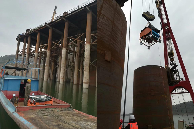 龍山大橋位于丹江口水庫漢江干流上,水深約70米,遠(yuǎn)超過平均水深約43米的珠港澳大橋和水深約30米的長江大橋,水下基樁施工難度巨大。該橋是丹江口市重點(diǎn)項(xiàng)目,全長829米,于2018年1月開工建設(shè),共有35根水上鉆孔灌注樁,均為深水樁基施工,樁基最大孔深110米,單根樁基鋼護(hù)筒重量達(dá)到117T,樁基鋼筋籠重量達(dá)到70T。