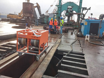 測量泥漿比重,泥漿指標(biāo)不符合技術(shù)要求會使檢測截面模糊或者檢測不到反射界面。井口平行安裝兩個帶槽鋼軌,把線架順著導(dǎo)軌推入井口頂部,調(diào)節(jié)線架令頭處在井口中心,并保證線架水平可靠放置;檢測絞車機(jī)架應(yīng)穩(wěn)定,儀器盡量對中,檢測前務(wù)必檢查線架各個滑輪和部件是否靈活運(yùn)轉(zhuǎn),尤其是探頭上方大動滑輪;檢查電纜線是否有脫落,確保儀器各部件處于良好狀態(tài);用干抹布或紙巾擦干凈探頭的8個傳感器表面,使其光滑明亮,再給8個傳感器表面均勻涂抹薄薄一層真空硅脂,增強(qiáng)信號接收效果。