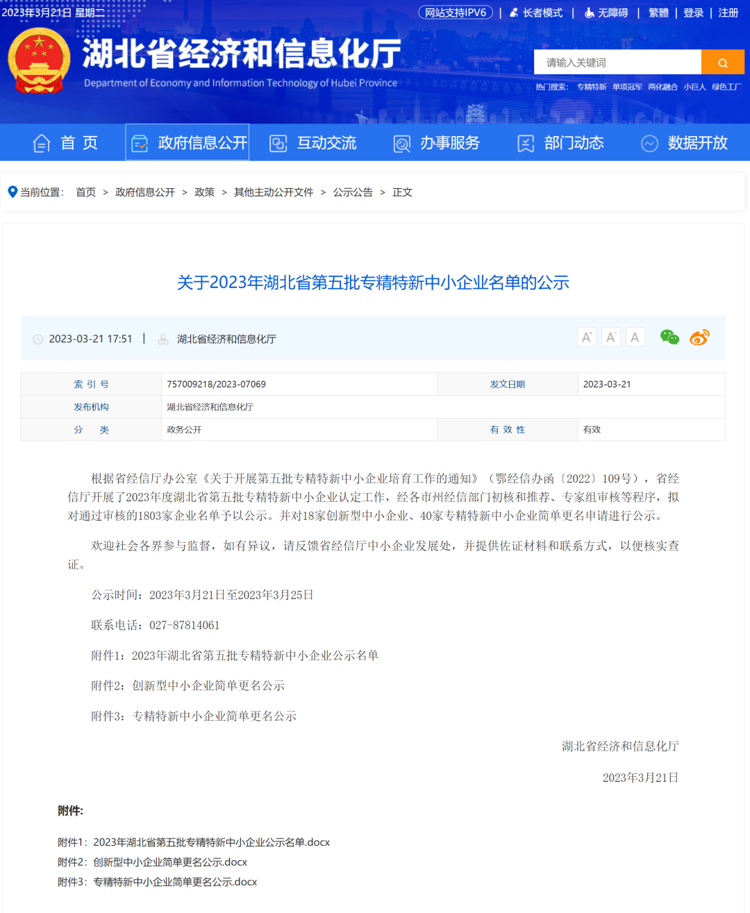 根據(jù)省經(jīng)信廳辦公室《關(guān)于開展第五批專精特新中小企業(yè)培育工作的通知》(鄂經(jīng)信辦函〔2022〕109號),省經(jīng)信廳開展了2023年度湖北省第五批專精特新中小企業(yè)認定工作,經(jīng)各市州經(jīng)信部門初核和推薦、專家組審核等程序,擬對通過審核的1803家企業(yè)名單予以公示。并對18家創(chuàng)新型中小企業(yè)、40家專精特新中小企業(yè)簡單更名申請進行公示。