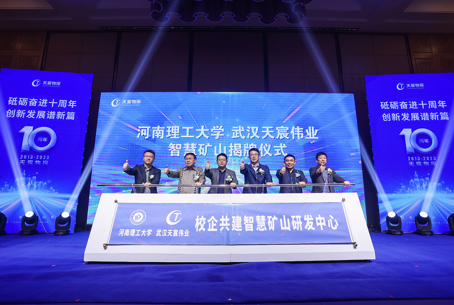 ? ? ? ?在慶典活動最后我們迎來了天宸物探十周年活動的重頭戲——河南理工大學(xué)、武漢天宸偉業(yè)智慧礦山研發(fā)中心揭牌儀式!