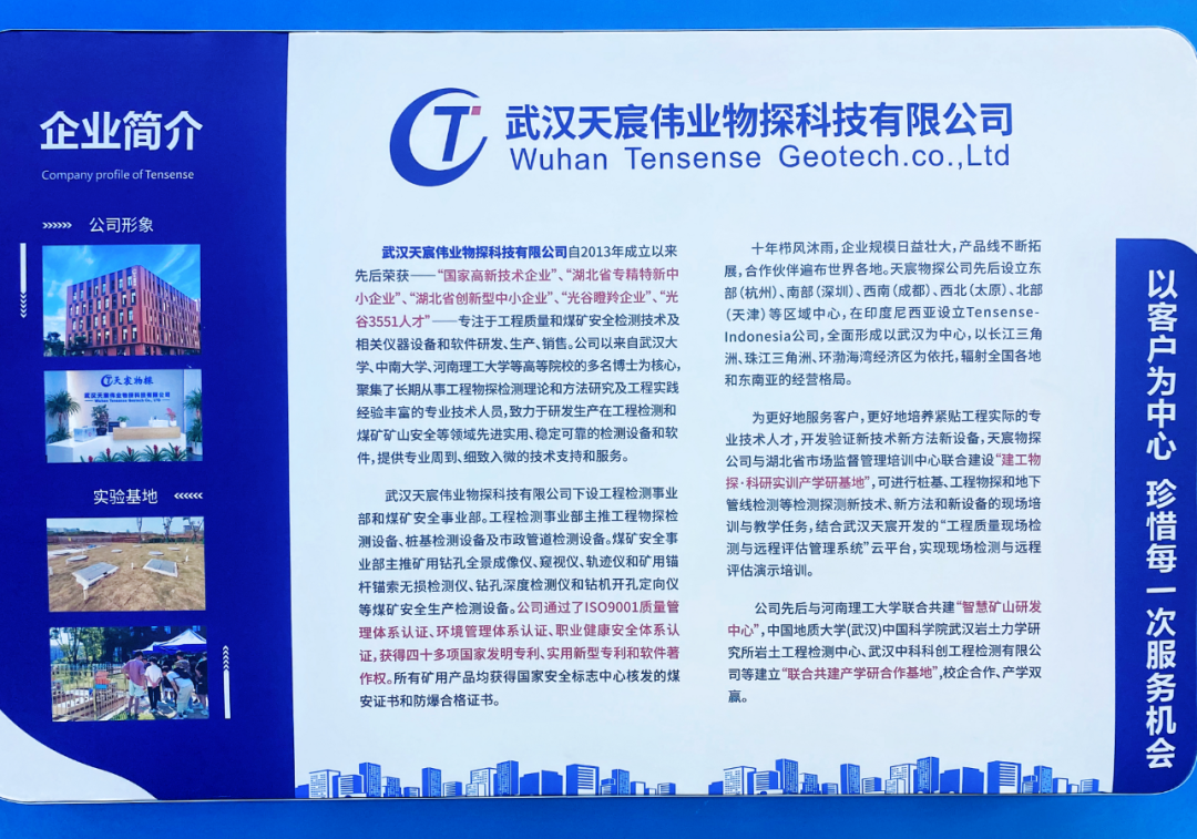 武漢天宸偉業(yè)物探科技有限公司(以下簡稱:天宸物探)成立于2013年,以推出一款產(chǎn)品,打造一個經(jīng)典的理念,專注于工程質(zhì)量和煤礦安全檢測技術(shù)及相關(guān)儀器設(shè)備和軟件研發(fā)、生產(chǎn)、銷售。以來自武漢大學(xué)、中南大學(xué)、河南理工大學(xué)等高等院校的多名博士為核心,聚集了長期從事工程物探檢測理論和方法研究及工程實踐經(jīng)驗豐富的專業(yè)技術(shù)人員,致力于研發(fā)生產(chǎn)在工程檢測和煤礦礦山安全等領(lǐng)域先進實用、穩(wěn)定可靠的檢測設(shè)備和軟件,提供專業(yè)周到、細致入微的技術(shù)支持和服務(wù)。
