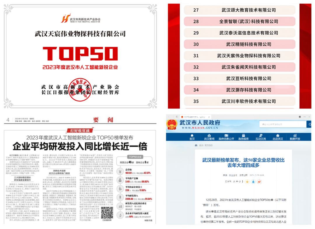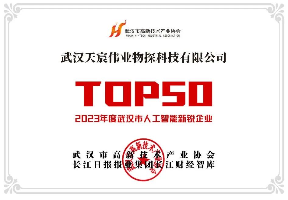 武漢天宸物探榮登“2023年度武漢市人工智能新銳企業(yè)”TOP50強榜單