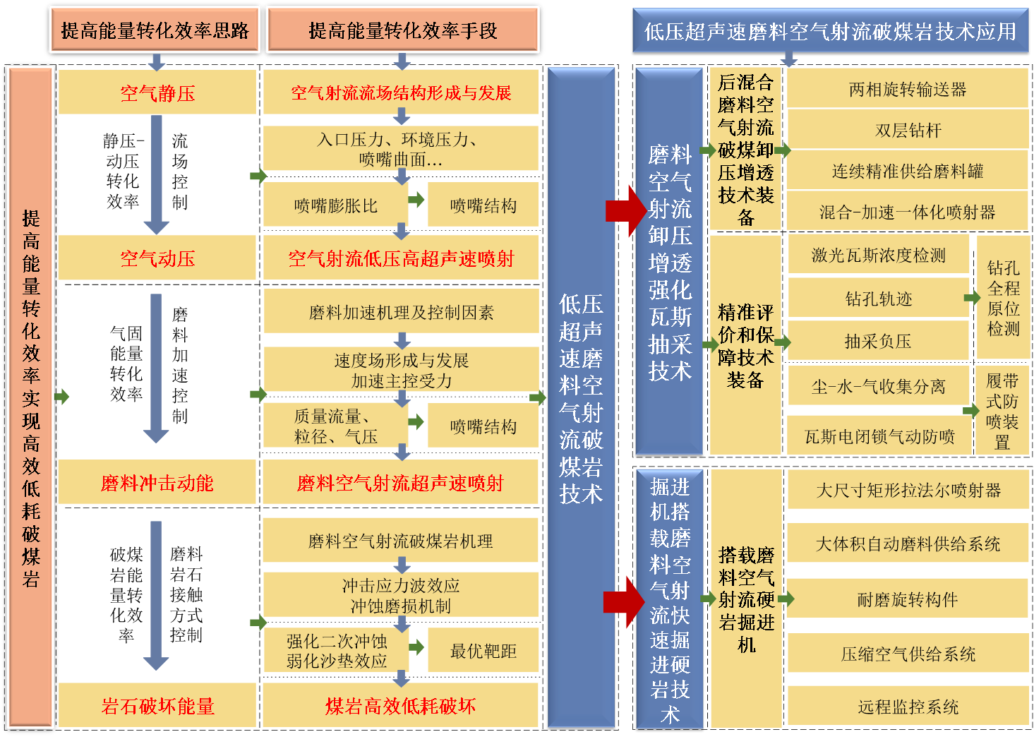 ? ? ? ?基于上述理念研發(fā)的磨料空氣射流卸壓增透強(qiáng)化瓦斯抽采技術(shù)裝備,從源頭上解決了煤層瓦斯抽采鉆孔坍塌和堵塞的問(wèn)題,創(chuàng)造了長(zhǎng)期有效的瓦斯流動(dòng)通道,實(shí)現(xiàn)了低滲煤層瓦斯高效抽采。而基于上述理念研發(fā)的多種掘進(jìn)機(jī)搭載低壓磨料空氣射流掘進(jìn)硬巖技術(shù)裝備,則攻克了刀具磨損快、換刀頻繁等關(guān)鍵難題,實(shí)現(xiàn)了硬巖隧道的快速掘進(jìn)。