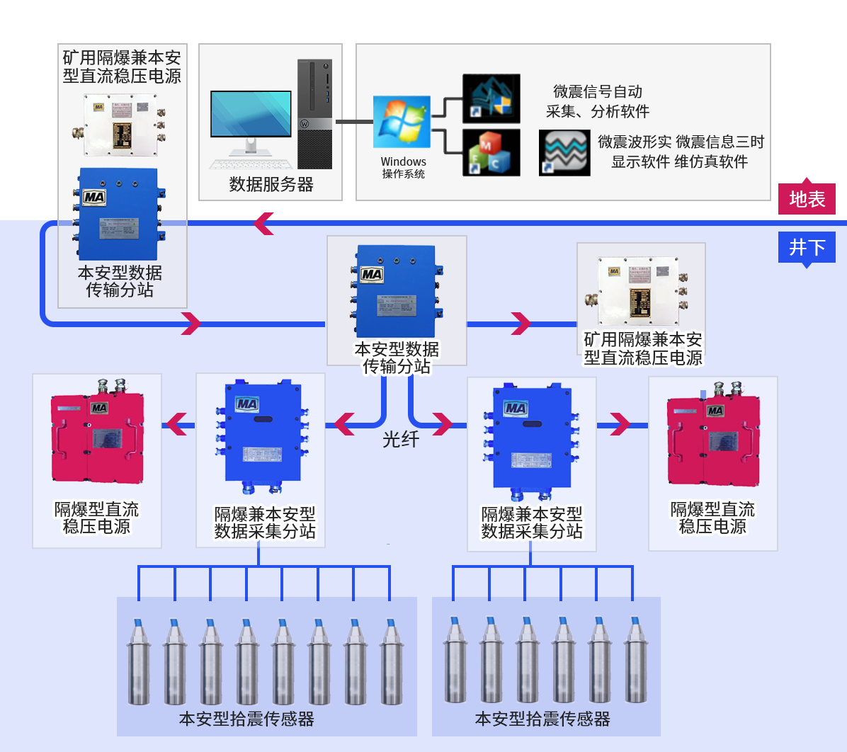 ? ? ? ?煤礦微震監(jiān)測系統(tǒng)適用于煤礦、沖擊地壓(巖)、煤與瓦斯突出、底板突水、頂板潰水、煤(礦)柱破裂等礦山災(zāi)害的監(jiān)測和預(yù)警。本系統(tǒng)分為井下部分和地面部分,其中,井下部分中包含傳感器、數(shù)據(jù)采集分站;地面部分為監(jiān)測主機、數(shù)據(jù)傳輸分站。